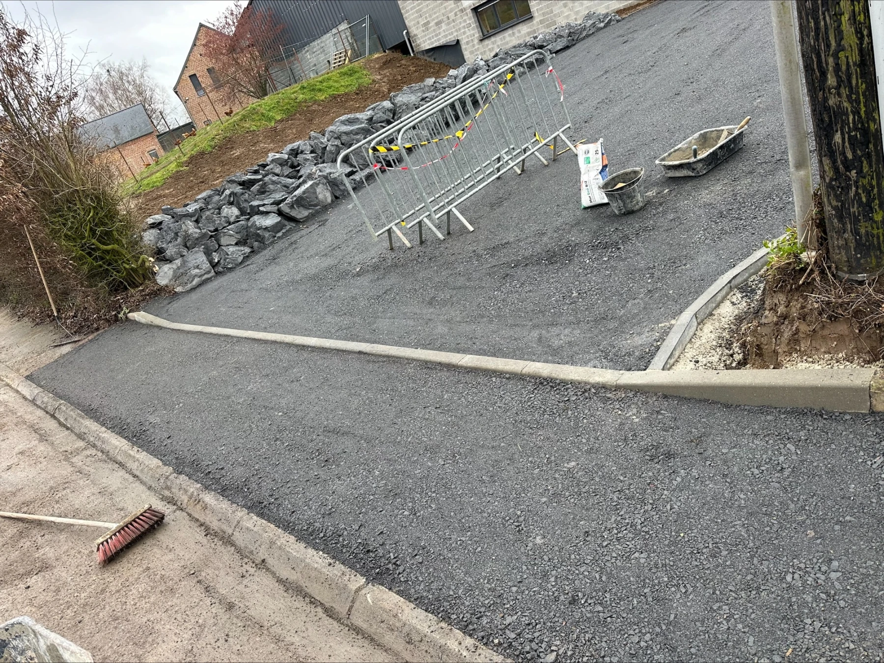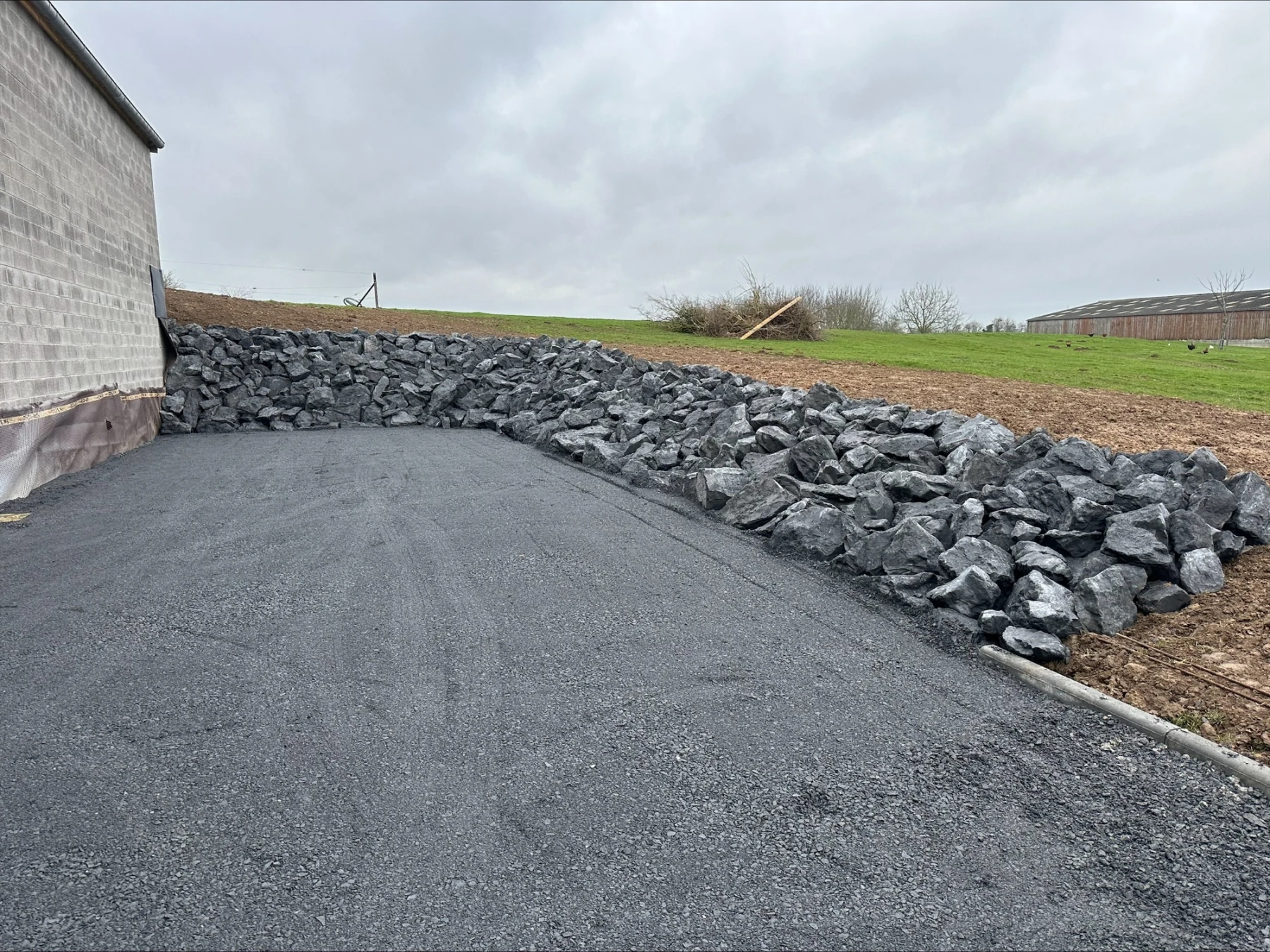 Terrassement, fond de forme en cailloux, enrochement et bordures béton